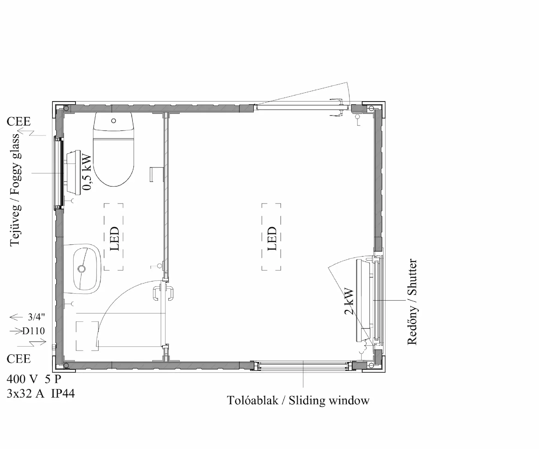- 1 db 400 V / 5 pólusú 3 x 32 A külső, vázba süllyesztett CEE csatlakozó – sorolható