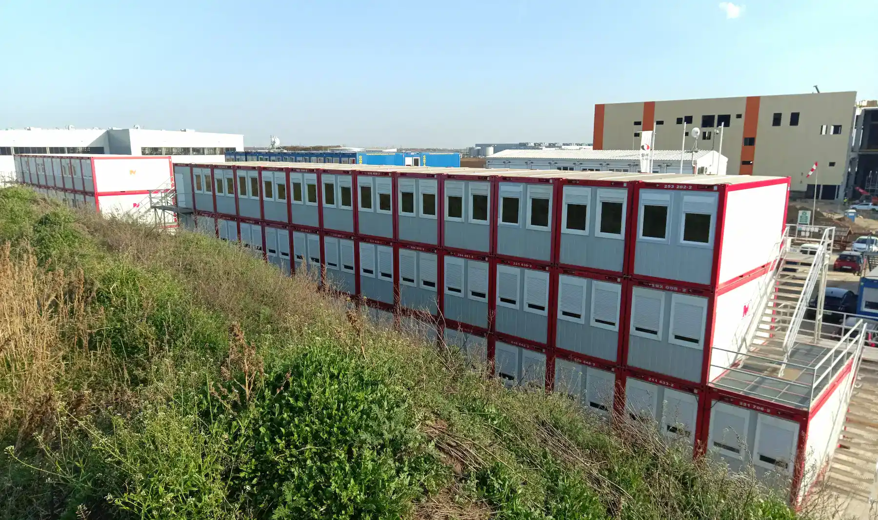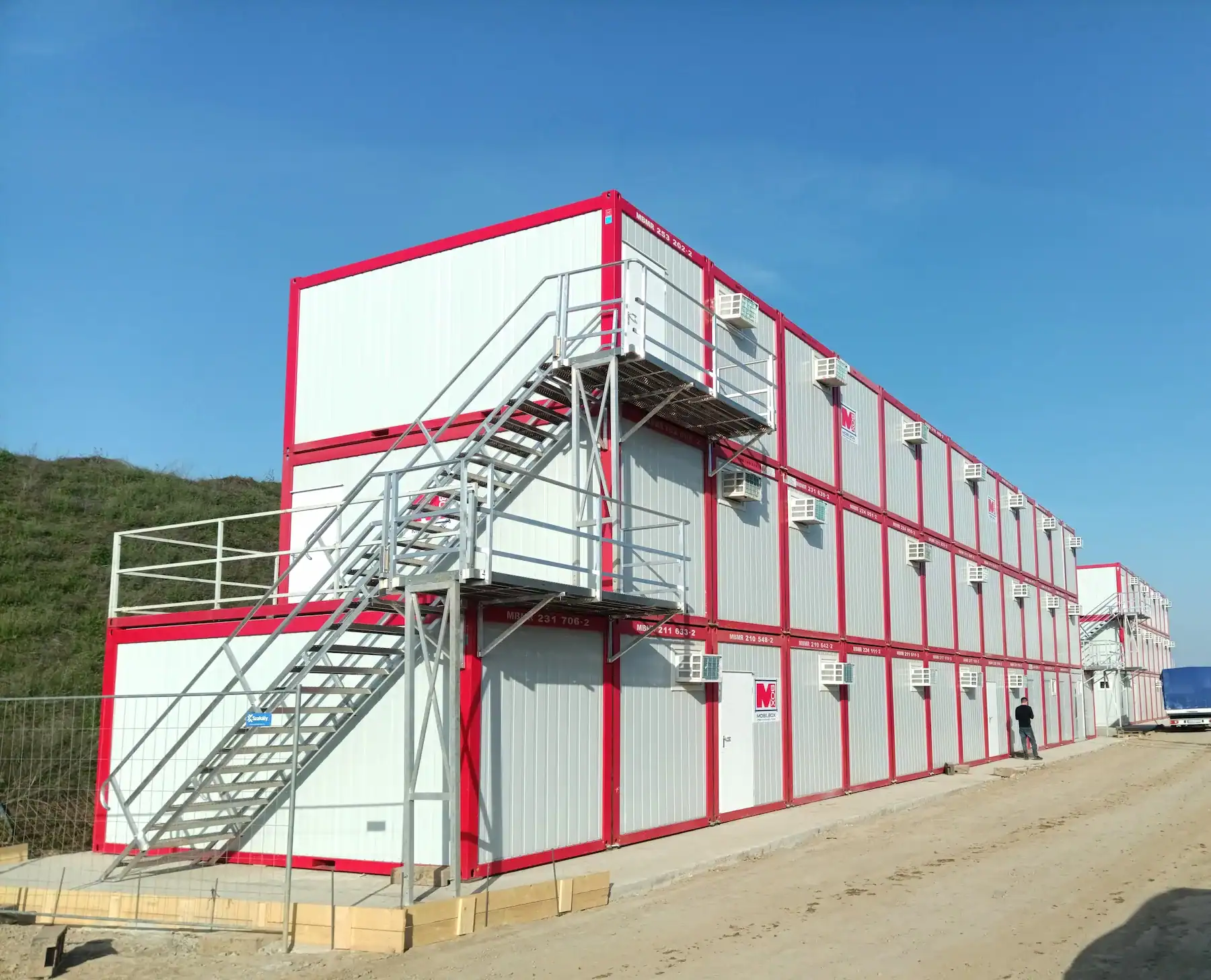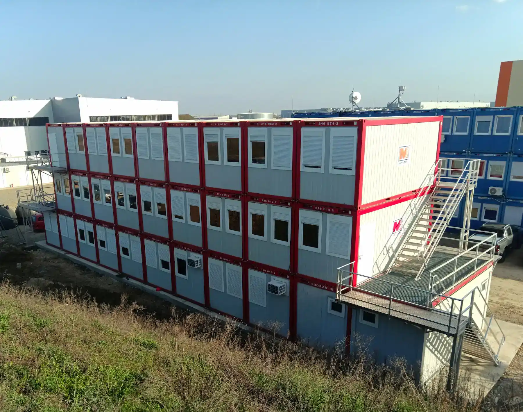 A debreceni projekt keretében megvalósított többszintes iroda- és étkezőkonténer komplexum gyorsan telepíthető, praktikus megoldást kínál ipari környezetben. A moduláris kialakítás komfortos munkateret és kulturált étkezési lehetőséget biztosít a helyszínen.